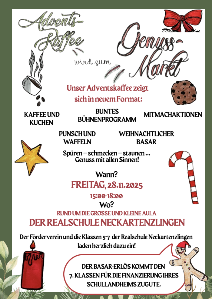 Die Klassen 5 bis 7 und der Förderverein der Realschule Neckartenzlingen laden herzlich zum Genussmarkt ein – dem neu gestalteten Nachfolger des beliebten Adventskaffees.