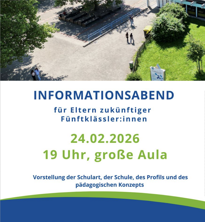 Am 24. Februar 2026 lädt die Schulleitung alle Eltern um 19:00 Uhr in die große Aula ein. Vorgestellt werden die Schulart, die Schule, unser Profil, die Schwerpunkte sowie das pädagogische Konzept. Nutzen Sie die Gelegenheit, unsere Schule umfassend kennenzulernen und Ihre Fragen direkt mit der Schulleitung zu besprechen.