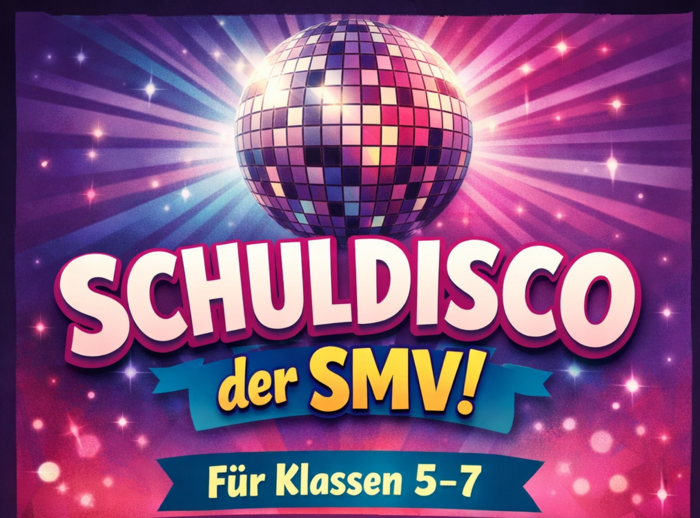 Am Donnerstag, den 05. Februar 2026, veranstaltet die SMV der Realschule eine Schuldisco für die Klassenstufen 5 bis 7. Die Veranstaltung findet von 17:00 bis 20:00 Uhr im Musiksaal statt.